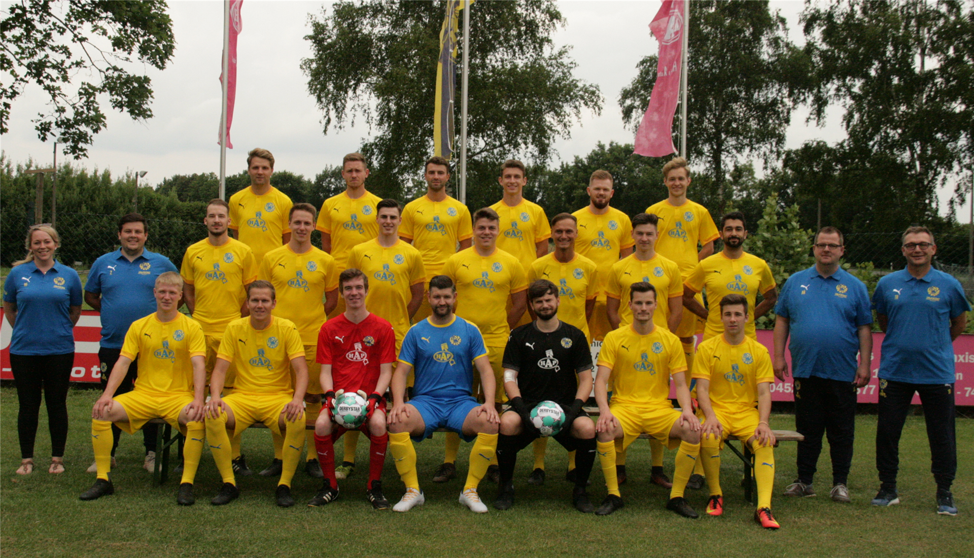 Mitte von links: Physio Angelina Forberger, Trainer Maik Hüttinger, Philip Popall, Marvin Tolksdorf, Henrik Harms, Tammo Busch, Benito Baumann, Andreas Adomeit, Betreuer Andreas Runge, Trainer Jürgen Muus